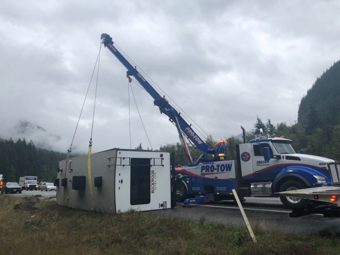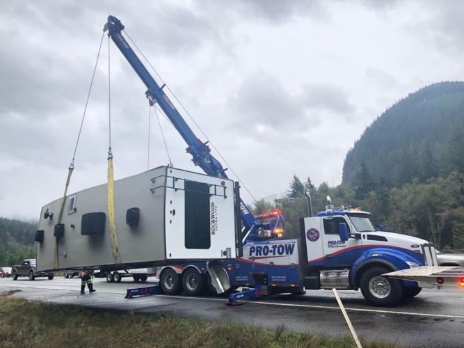 Pro-Tow is on call 24 hours a day, 7 days a week, and was quick to respond to this call. Using our specialized equipment, an overhead crane lift, we were able to load the 5th wheel carefully onto our truck. While our team was hard at work, we were able to keep lane closure to a minimum.