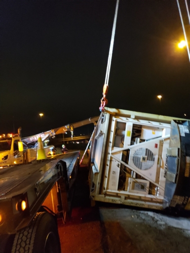 Crawford and Co., the insurance company, requested extraordinary measures to save the cargo inside the container. With authorization, we did a temperature test and visual inspection. We found the cargo was still frozen, so there was still a chance to save it. Our skilled team safely lifted the container without further damage. The customer supplied the necessary chassis with a power unit to power the refrigerated unit once again. A service tech handled the installation for us and continued to do service calls to ensure everything remained frozen.