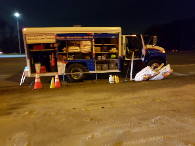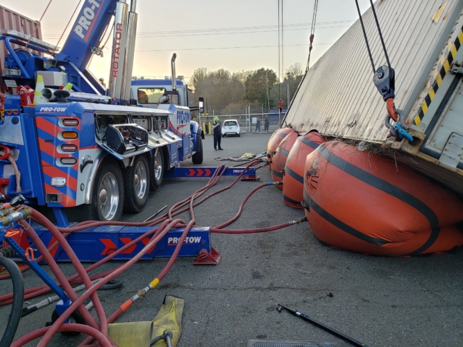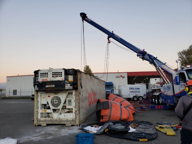 We successfully lifted the container but a new problem arose as the refrigerator fuel tank began to steam. We immediately deployed our recovery personnel to begin safe control measures to contain the new leak. Once it was safely contained, our team finished loading the suspended container and safely secured it, finalizing our emergency incident response. While our team moved the container and tractor to our secure storage yard, Pro-Enviro continued the roadway’s extensive cleanup work.