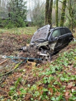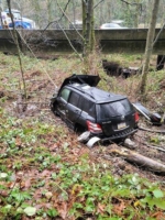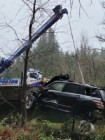 At the scene, we saw the vehicle deep in the embankment, stuck in trees and mud. The SUV was severely damaged. Due to the steepness of the bank, we had to make a careful accident recovery plan to fish it out and get it back on the roadway.