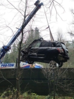 In this incident, on January 10, 2022, Team Pro-Tow responded to a call to fish a Mercedes SUV out of a steep embankment. The vehicle had flown over the concrete guardrail on I-90 in Issaquah, WA, prior and required accident recovery.