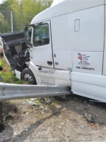 We arrived at the scene, performed a scene evaluation, and found the bobtail tractor resting precariously against the guard rail. Not only that but the engine oil pan was also damaged and had already lost 10 to 15 gallons of engine oil. That was a big problem that we needed to address immediately with special accident recovery care.