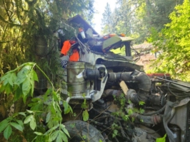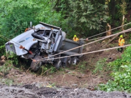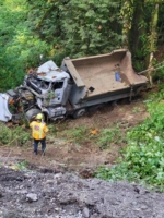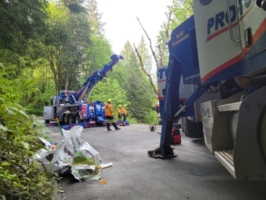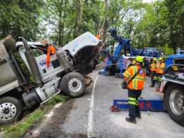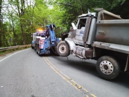 Maybe you’ve heard the saying before, what comes up must go down. But, in this case, the scenario was the opposite. The dump truck in this accident flew over a metal guardrail and landed about 150 feet down into a steep embankment. So, we needed to bring it back up the roadway 150 feet.