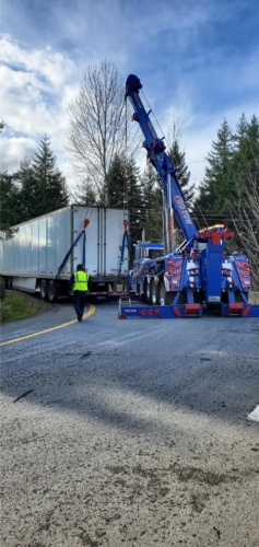 The truck was about 80,000 pounds, which meant we had to use our heavy-duty crane style wrecker to undo this mistake. After we carefully set it up and rigged the trailer properly, we were able to relocate the loaded container to a better position and location. Then the driver was able to continue his travels and make his delivery of paper rolls.