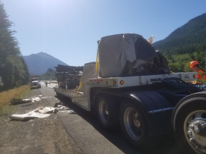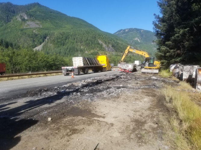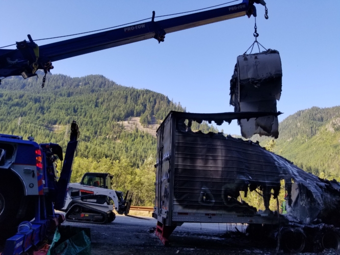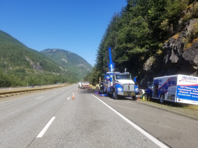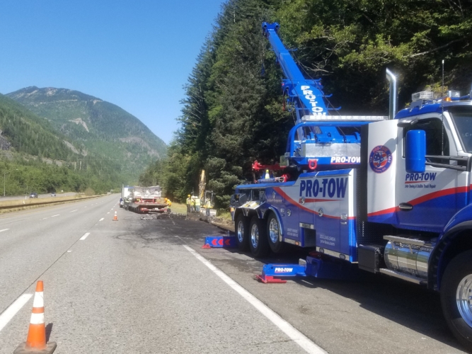 Burned to the ground on Interstate 90 in North Bend, Washington, the Washington State Patrol and WSDOTcalls on #teamprotow and Pro-Enviro Motor Vehicle Spill Response to solve the problem on this busy section of Snoqualmie Pass. Using Miller Industries, Caterpillar, Bobcat Company, Bobcat Equipment, and Advanced Environmental Solutions equipment teamed up with PGH Excavating, Inc. this huge mess was cleaned up and moved quickly and professionally to get all lanes open ahead of schedule. Nice work, team!