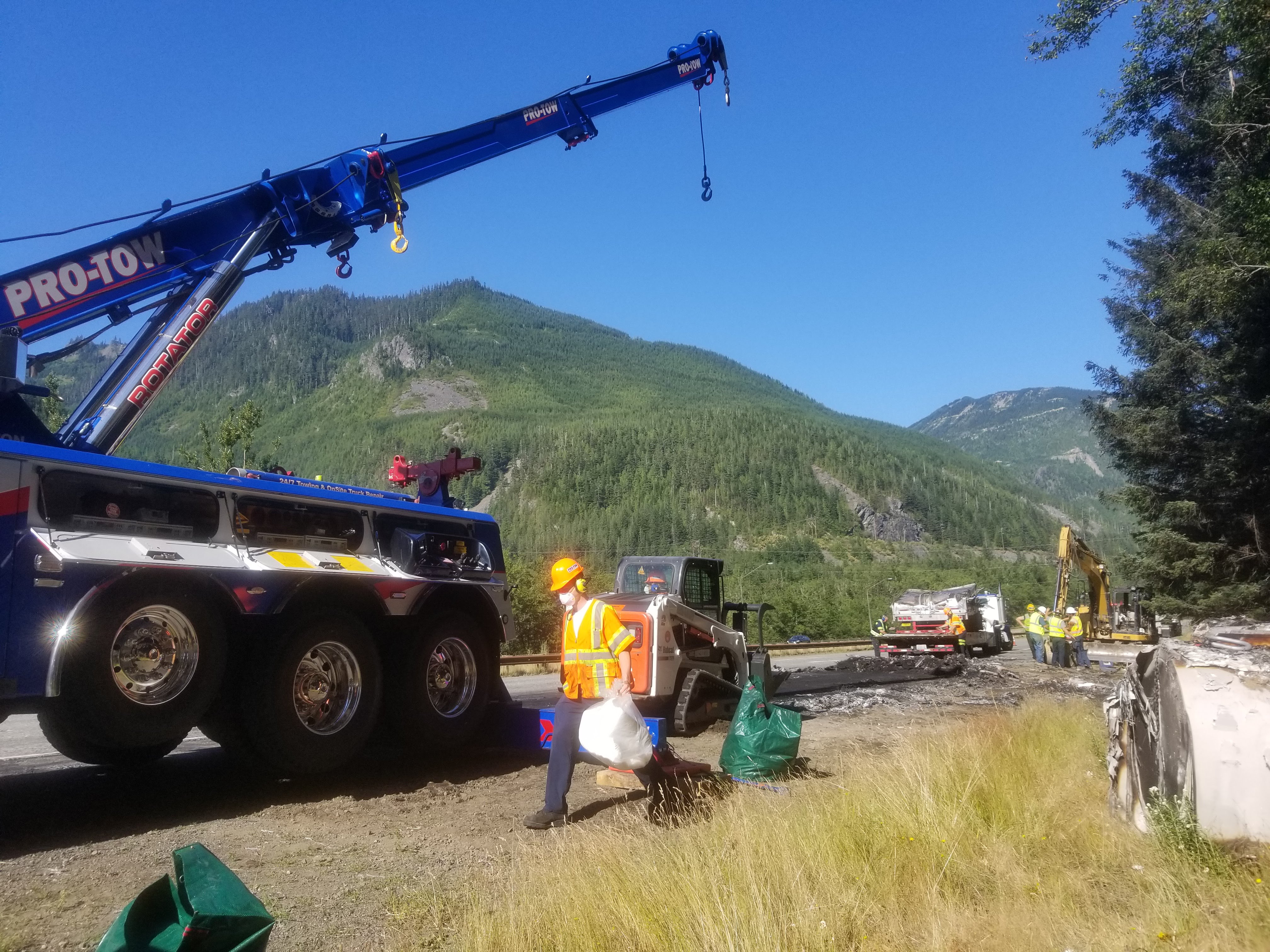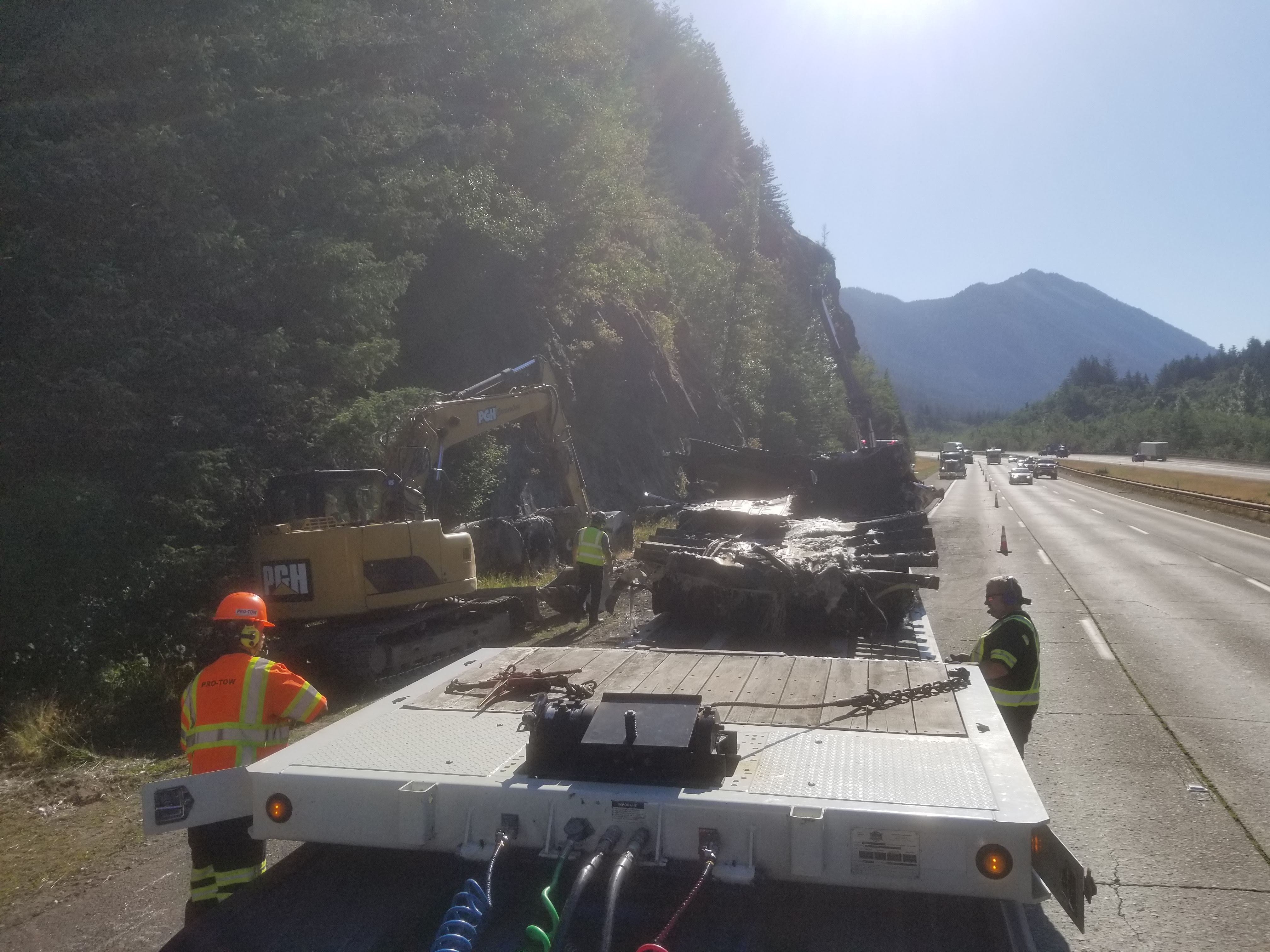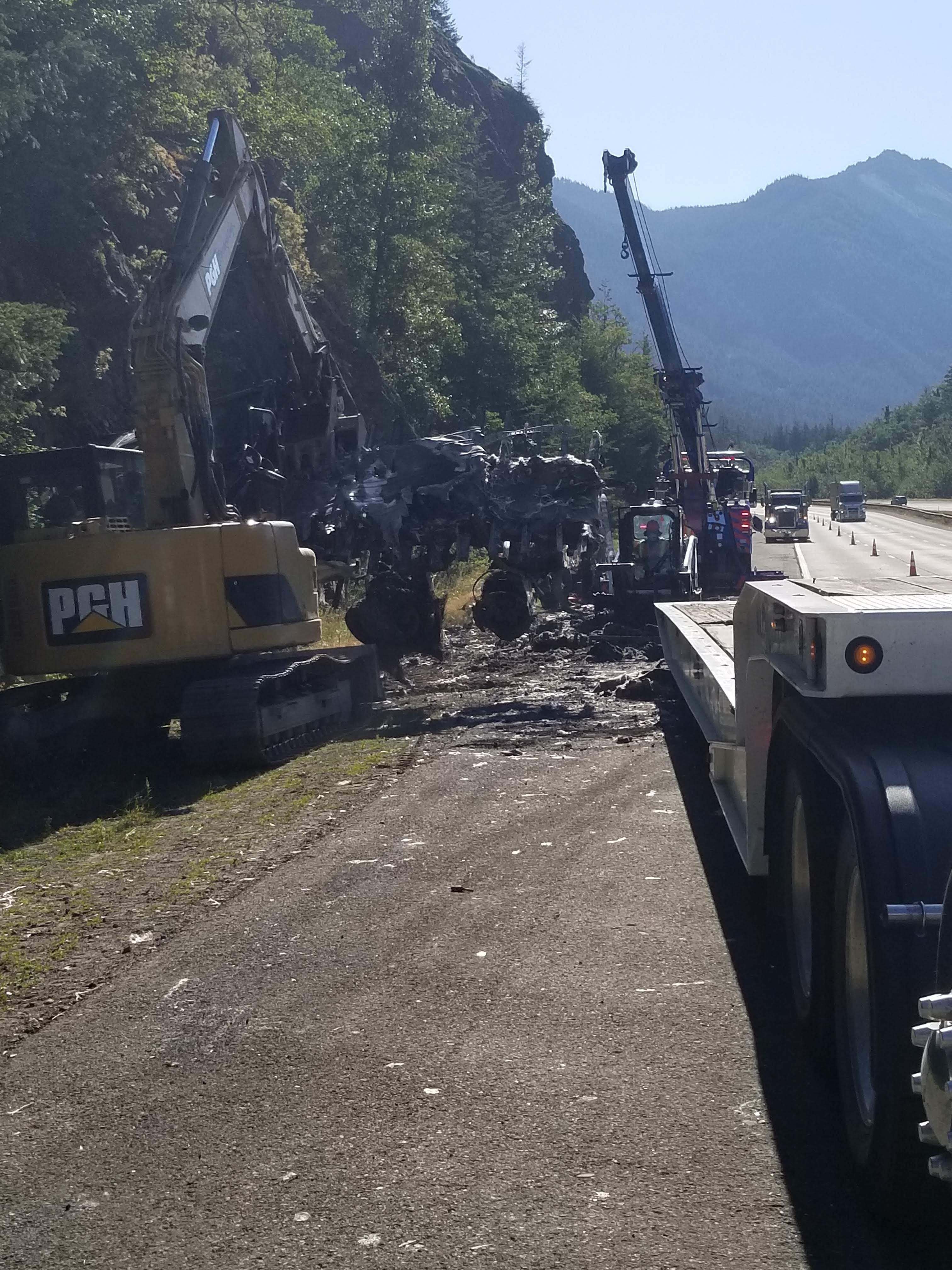 Burned to the ground on Interstate 90 in North Bend, Washington, the Washington State Patrol and WSDOTcalls on #teamprotow and Pro-Enviro Motor Vehicle Spill Response to solve the problem on this busy section of Snoqualmie Pass. Using Miller Industries, Caterpillar, Bobcat Company, Bobcat Equipment, and Advanced Environmental Solutions equipment teamed up with PGH Excavating, Inc. this huge mess was cleaned up and moved quickly and professionally to get all lanes open ahead of schedule. Nice work, team!