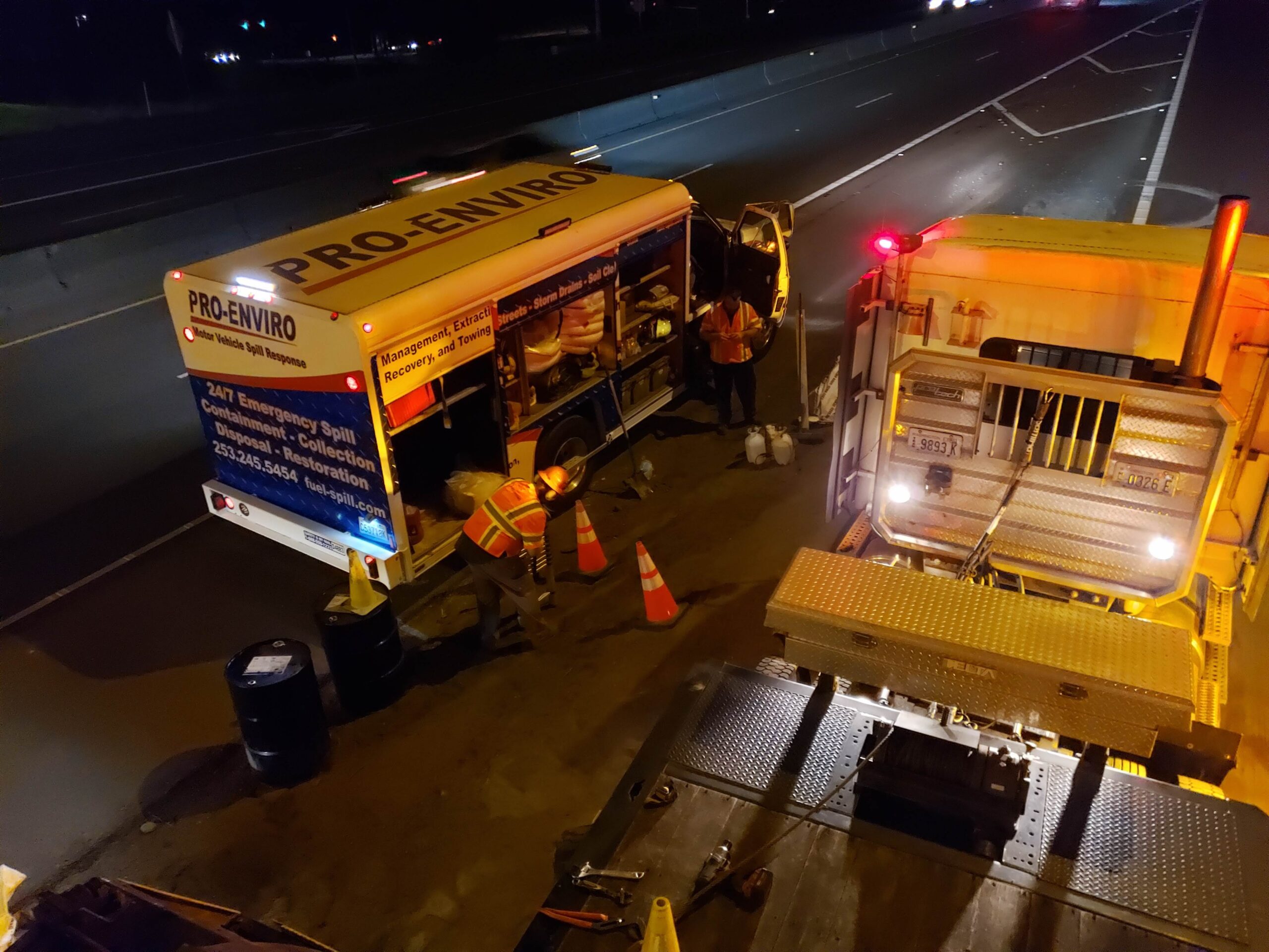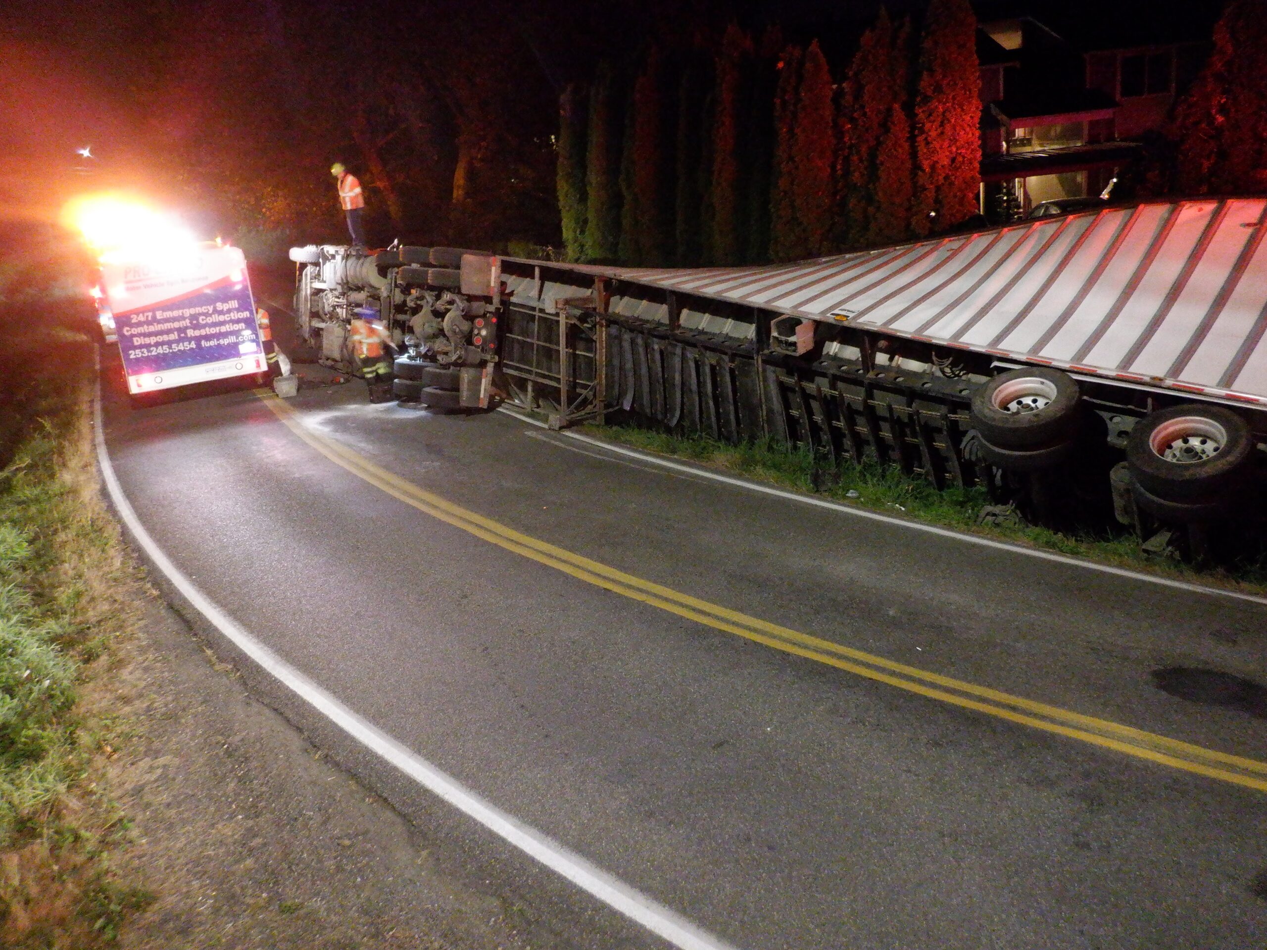 In this incident, on September 6th, 2020, Pro-Tow responded to an emergency dispatch for a truck and trailer overturned into a ditch in Sumner, WA. The fully loaded truck was leaking oil and diesel fuel and was blocking the roadway. We had to get there with Pro-Enviro...