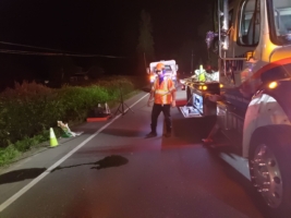 As soon as the unit was safely under the powerlines, we installed rigging for a safe catch and uprighting. We worked slowly and carefully with the crane lift services until the unit was safely upright on the roadway. We then temporarily stored our rigging and prepared to secure the truck for towing. Next, we separated the trailer, loaded it onto the flatbed tow truck, and secured it. Meanwhile, our Pro-Enviro team continued handling the spill cleanup and recovery of any debris and contamination.