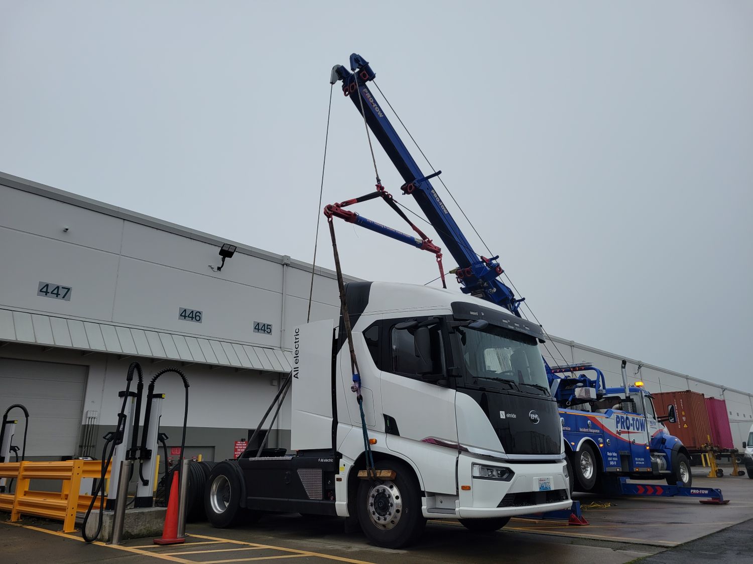 When our operator arrived at the scene and checked the truck’s batteries, we found it had absolutely no juice. Jumpstarting an EV semi-tractor is tricky and can be dangerous. While EVs have a 12-volt battery that can be boosted, they’re not designed the same way as a combustion engine.
