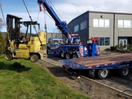 With the forklift upright, we repositioned the equipment, rerigged and did an overhead lift. The forklift was moved to the heavy-duty flatbed and secured into place. Once we secured the first equipment recovery, the second forklift was loaded with ease.