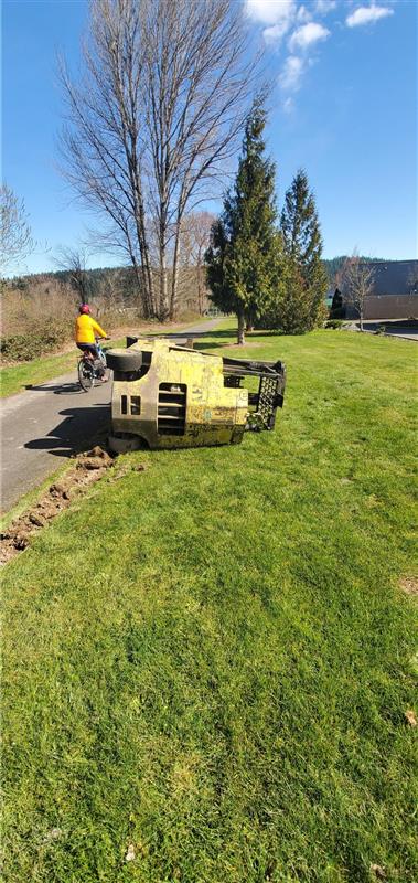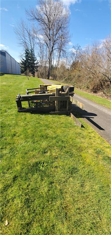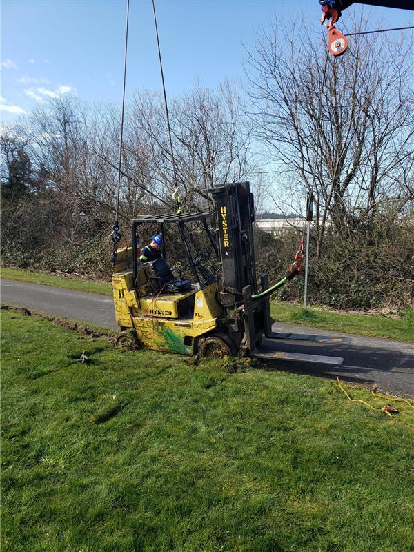 After getting authorization to use the bike trail for the recovery, we moved the recovery truck into position. We installed the rigging to safely upright the forklift and avoid more damage to the machine or environment. Our team used a combination of soft straps, shackles, and four lines attached to the forklift to handle the safe and successful recovery.