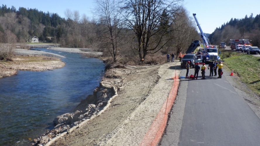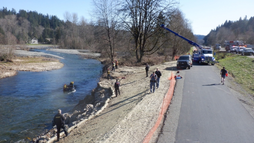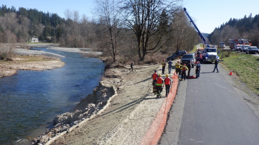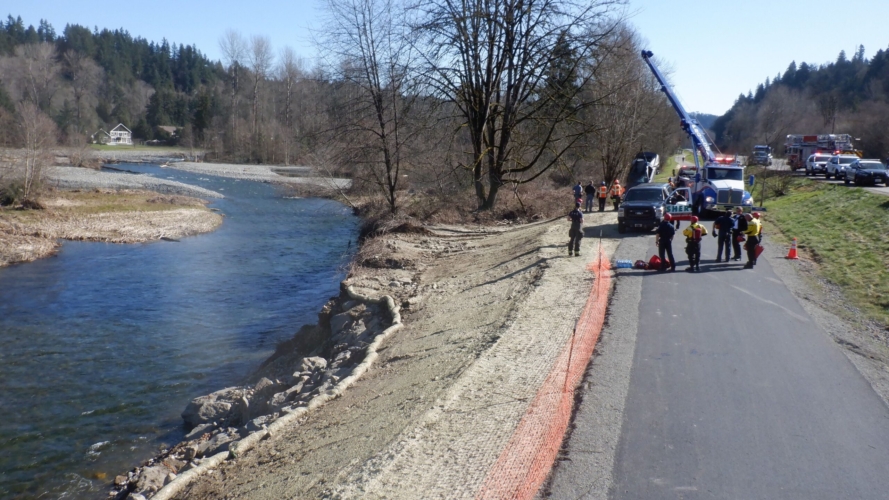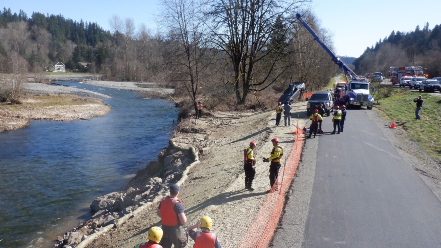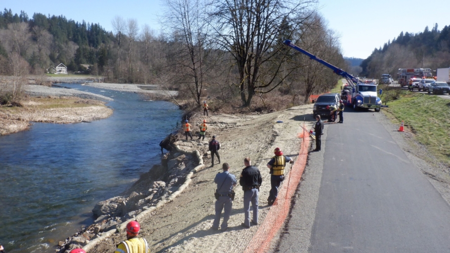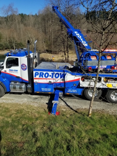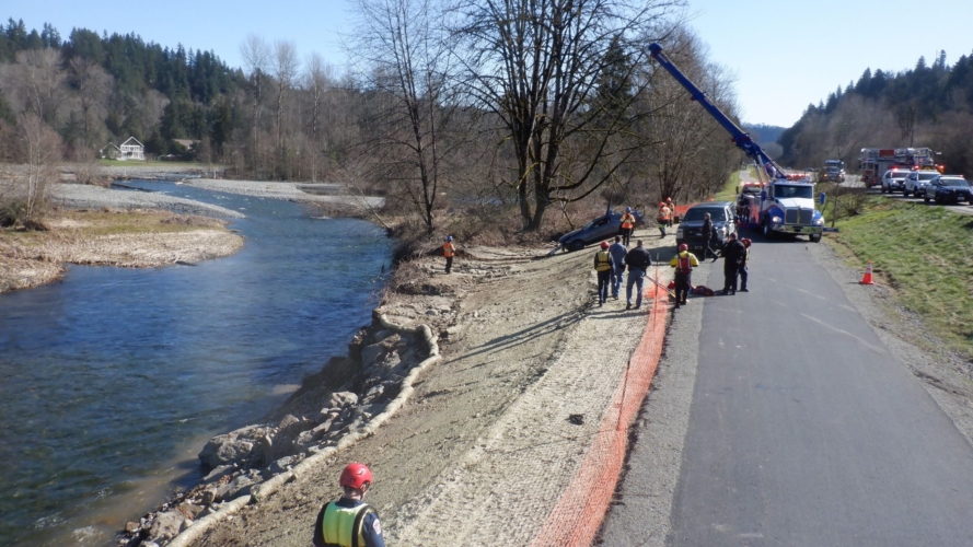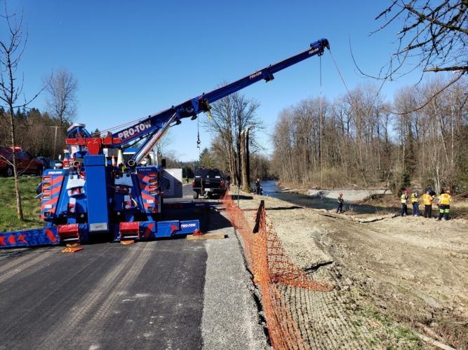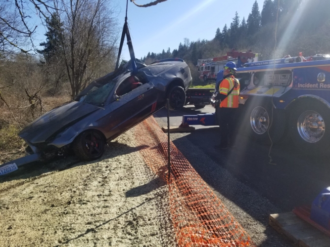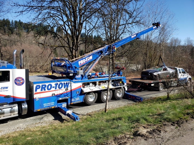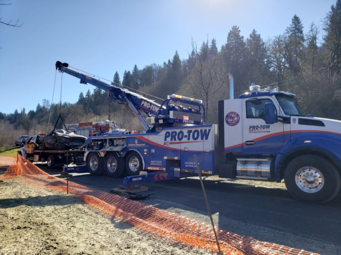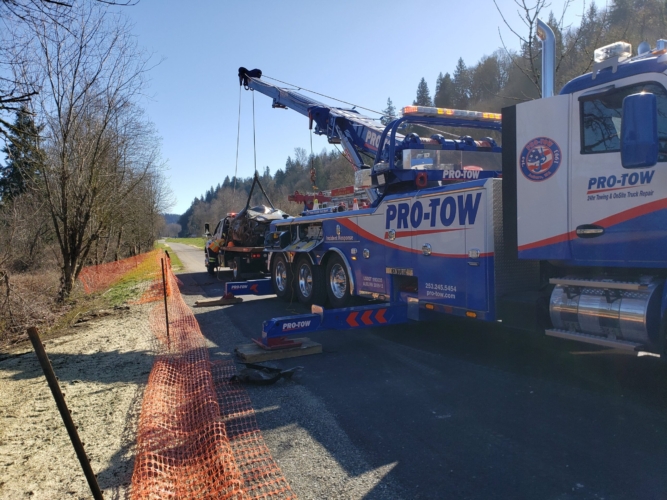 Team Pro responded to the scene with a light-duty recovery wrecker and reported to Incident Command. Responders included the Washington State Police, Washing State Fire Department, and King County Parks and Recreation.