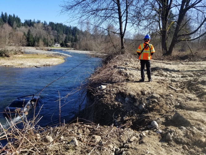 After creating a safety and accident recovery plan, our team put on their personal protective equipment and other safety gear and got to work. Very carefully, we brought the equipment down a bicycle path and set up on the riverbank for the accident recovery. The riverbank’s access and strong currents created considerable safety hazards that required mitigation.