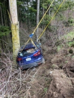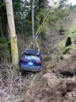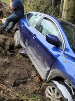In this incident on May 4, 2021, a Nissan Rogue went off the road and crashed into a very steep ditch and fell against a tree. Unable to get out alone, our trusty Team Pro-Tow responded to a call to help rescue the trapped car.