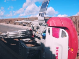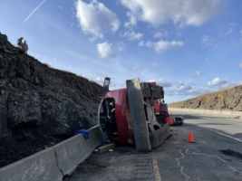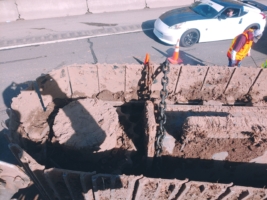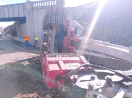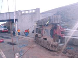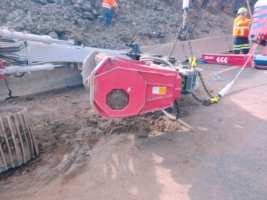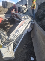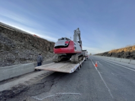On March 23, 2021, a brand new excavator hit a bridge, rolled over, and required heavy equipment recovery. Team Pro-Tow used our heavy-duty crane-style wrecker to lift the excavator back on solid ground.