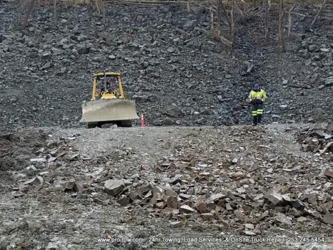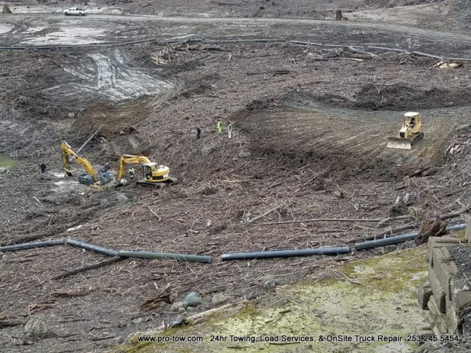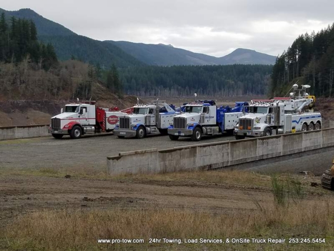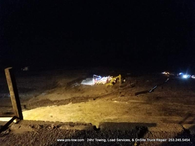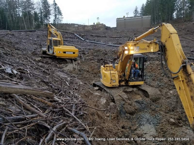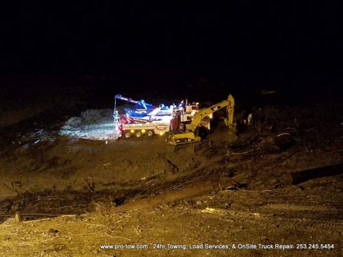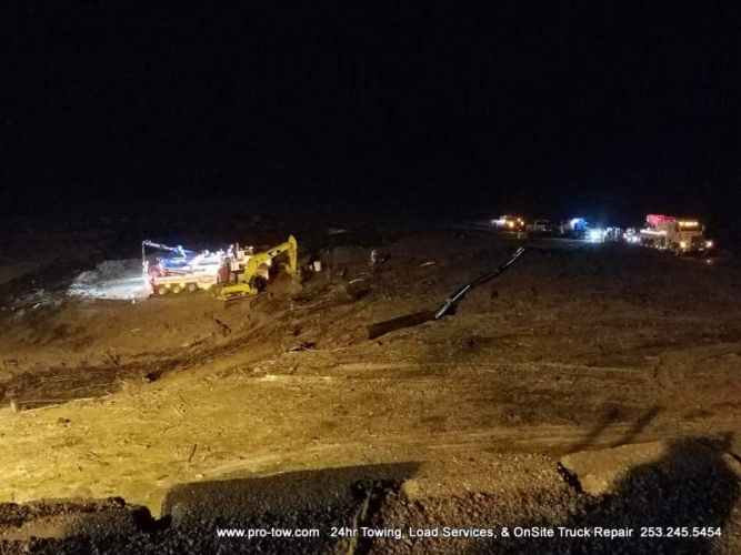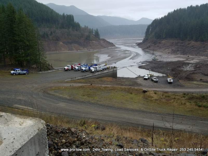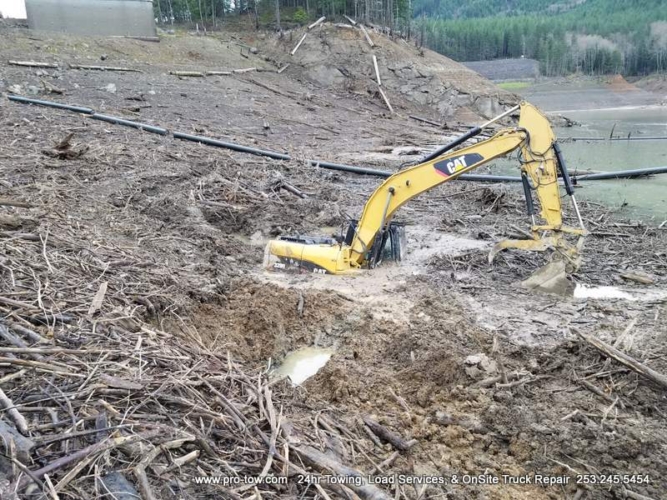On November 20, 2016, Pro-Tow responded to a call that was both unique and challenging. An excavator was stuck, well, nearly entirely buried at the Howard A. Hanson Dam, Eagle Gorge Reservoir. We calculated about 180,000 pounds worth of resistance to get this piece of machinery out.