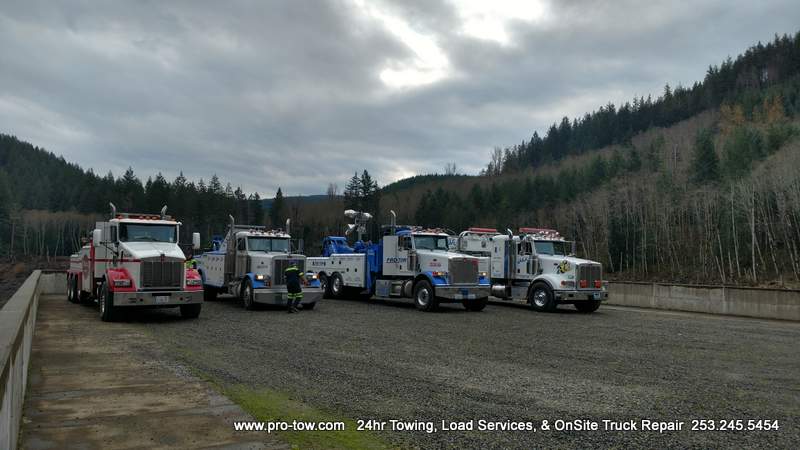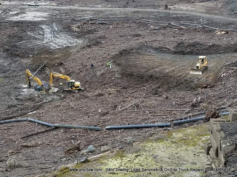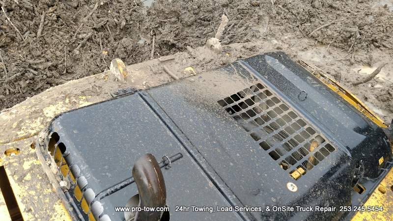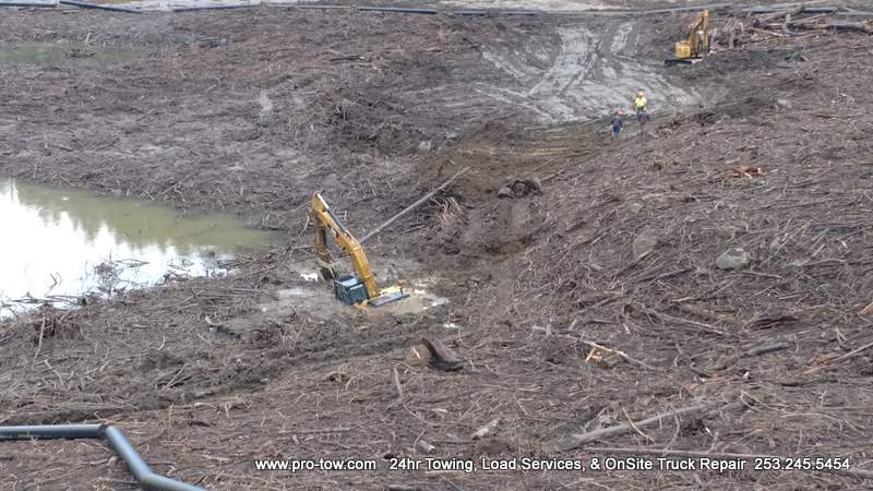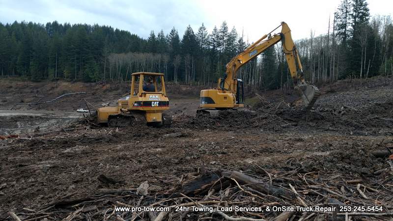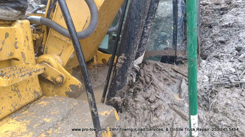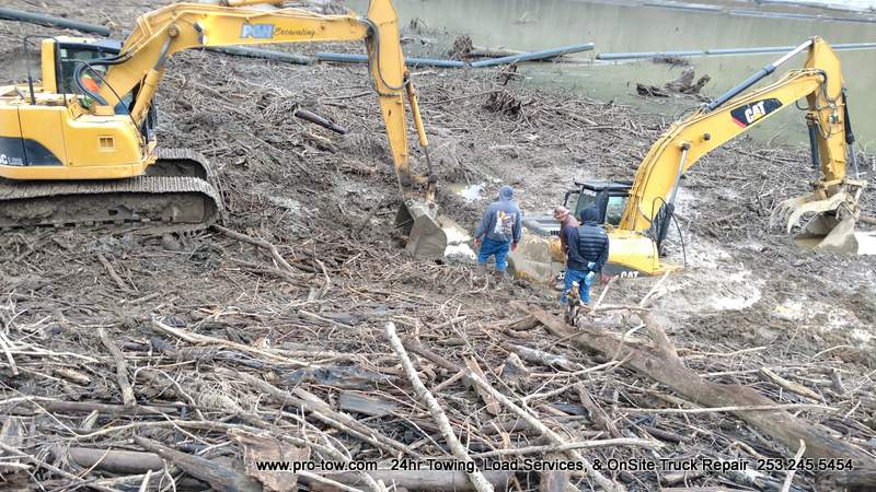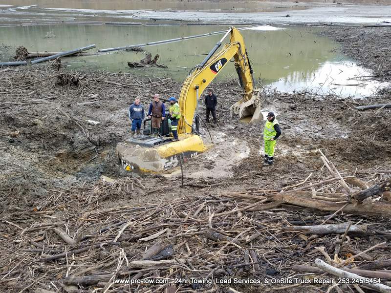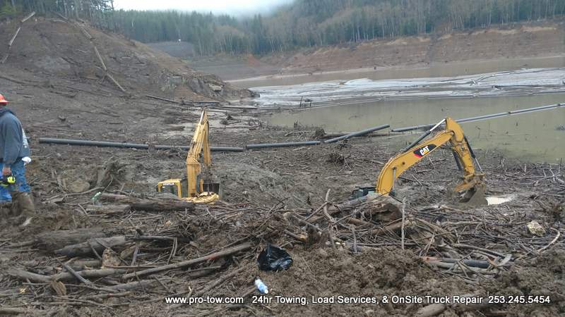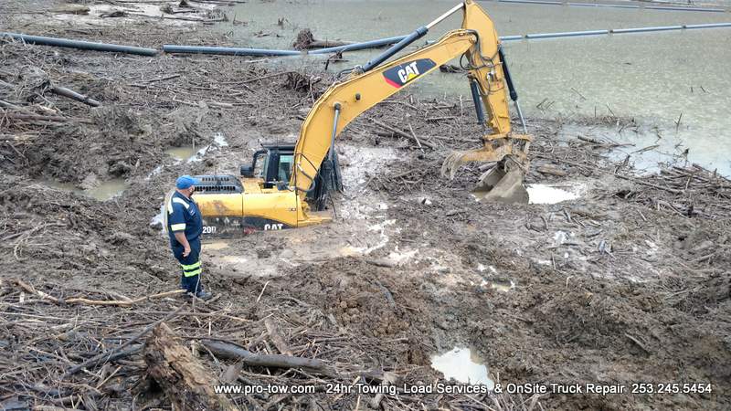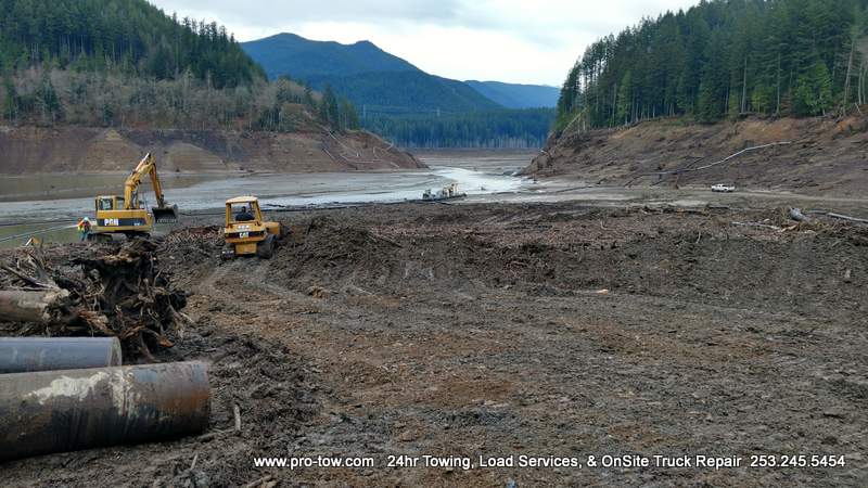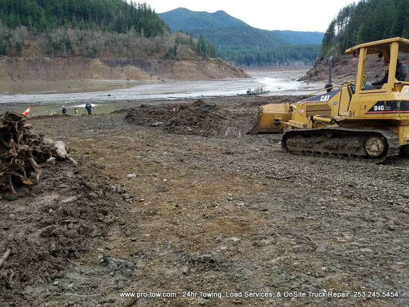 On November 20, 2016, Pro-Tow responded to a call that was both unique and challenging. An excavator was stuck, well, nearly entirely buried at the Howard A. Hanson Dam, Eagle Gorge Reservoir. We calculated about 180,000 pounds worth of resistance to get this piece of machinery out.