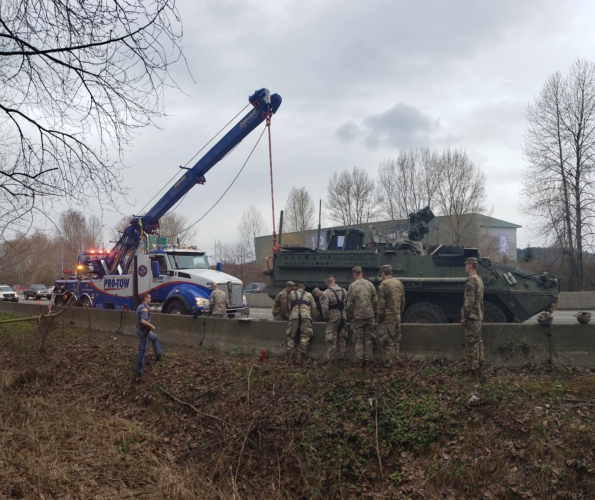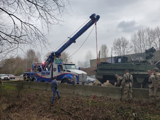 #WashingtonStatePatrol #GoAarmy and #WSDOT calls on PRO-TOW to help with a tire chain for the Army Convoy on I-405 on Monday March 25, 2019 during rush hour traffic. After the convoy suffered a flat tire, the team quickly went to work to replace the tire. Unfortunately, due to its size the convoy was blocking lane 1 on NB I-405 in a busy area and a busy time of the day. After suffering a failure with the team’s jack lifting the 40,000 pound vehicle, the command called on Pro-Tow with their 50 Ton Rotator crane style heavy duty wrecker. The crane style wrecker was able to make quick and safe work with the overhead lift rotating over the hood. Not blocking the highway, minimal lane closure, and huge lifting capacity got the team back in the convoy and traffic flowing normally in #RentonWa. #Millerindustries #teamprotow #xtrema #phillystran #crosbyindustries