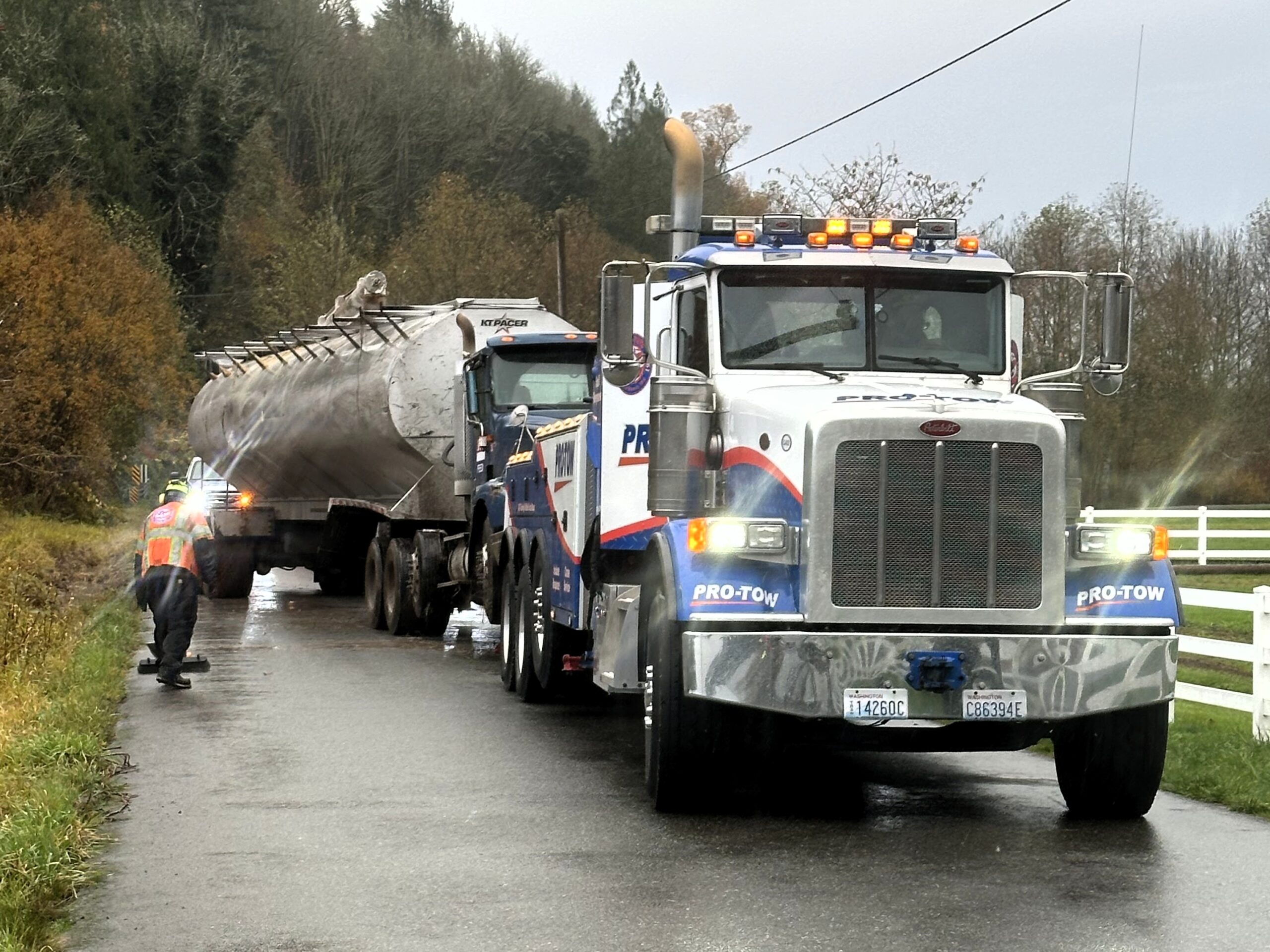 Pro-Tow by FleetEasy recently responded to a challenging heavy-duty recovery on Fall City Rd, Fall City, WA, where a tanker truck had gone off the roadway and rolled onto its side. The tanker was damaged, and the recovery needed careful planning. Our priority is always to recover the unit safely while preventing any additional impact to the equipment or the surrounding area.