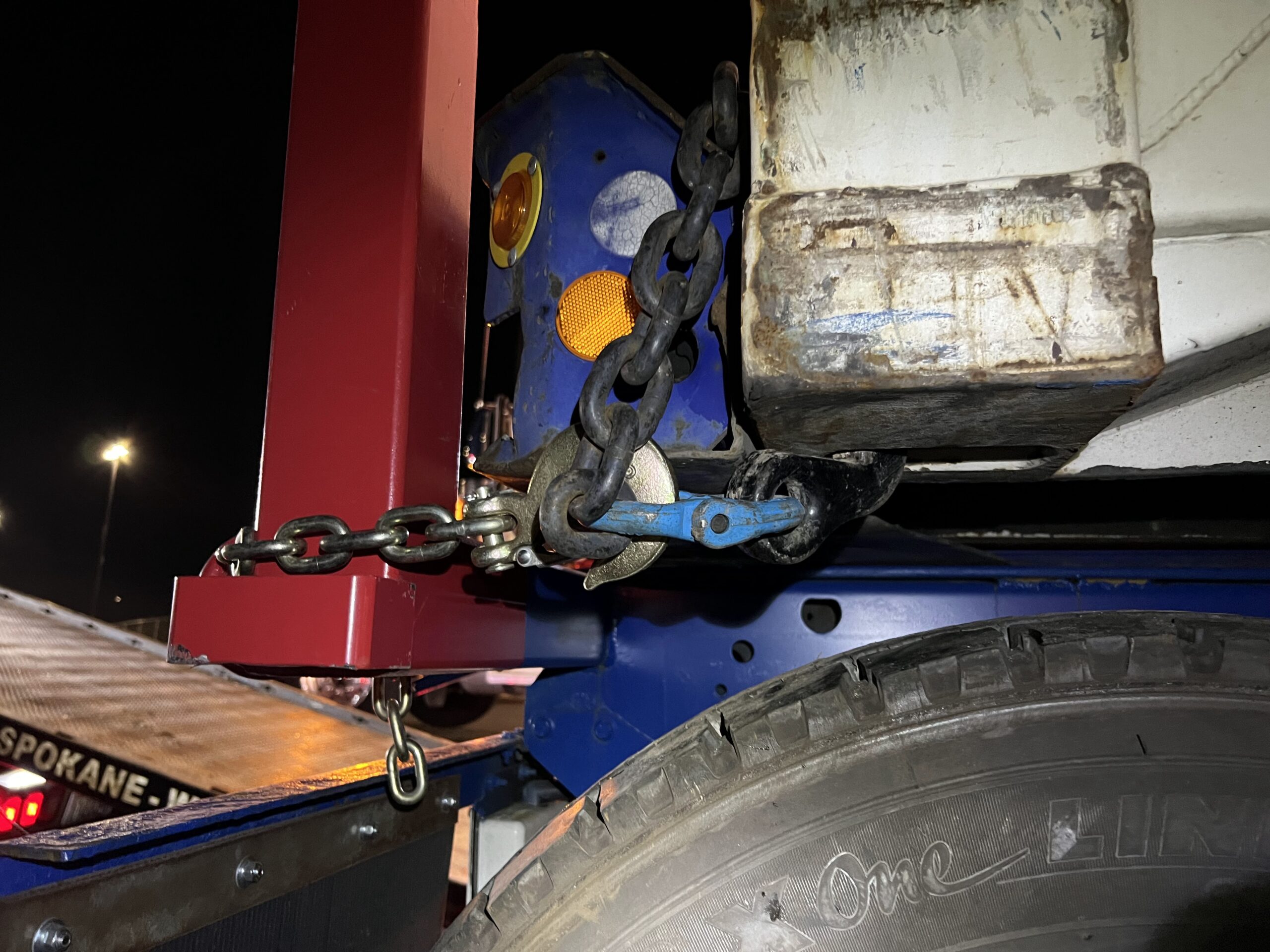 We attempted to reposition the dolly using a side puller on the flatbed. Team Pro-Tow made multiple adjustments, but there was no ideal orientation for a better load. In the end, we secured the front as designed and used chains to anchor the back. Doing it this way made it secure for transport. Strap protection was also added to the upper load strap to prevent any damage.