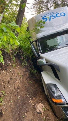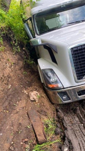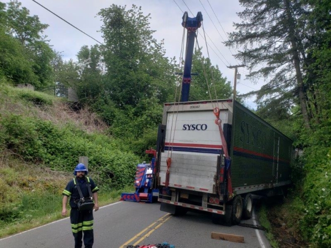 Our team carefully operated the rotator in harmony with the recovery truck parked in the front. We finally were able to get the truck and trailer back on the roadway and positioned for a heavy truck tow. We removed all the rigging and towed the casualty to a safe location.