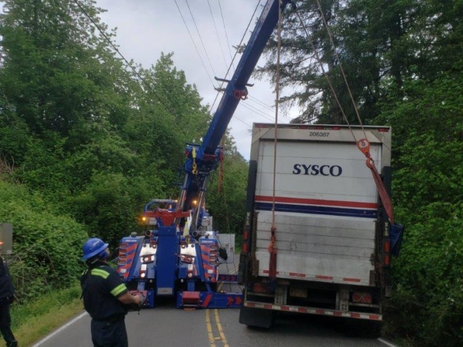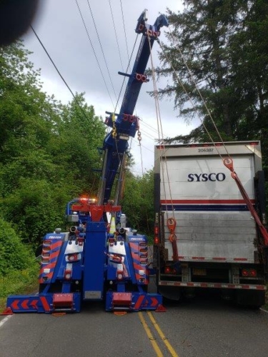 We decided to winch forward, setting the recovery truck in front of the casualty. We set up the rotating crane-style wrecker to perform a rear overhead light and reposition the truck and trailer on the road.