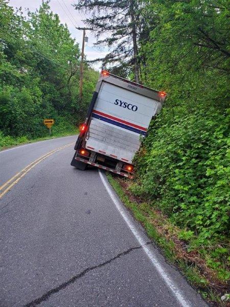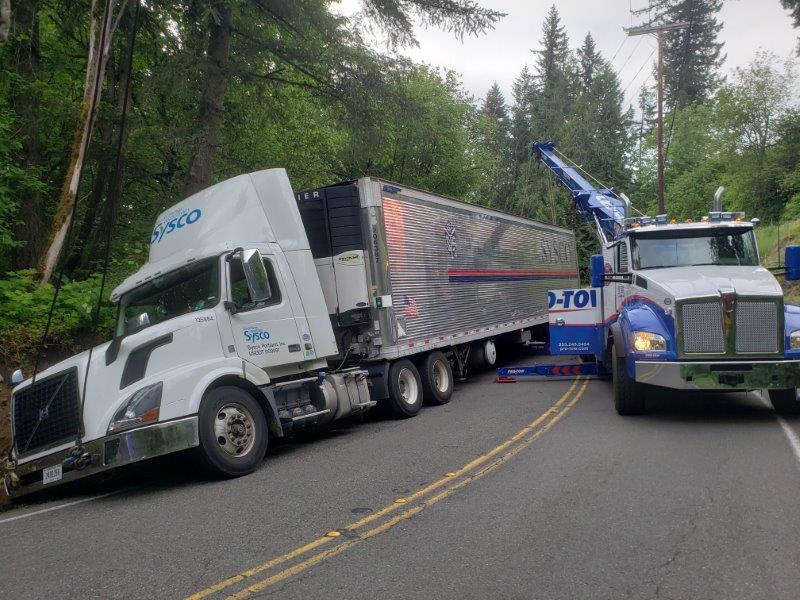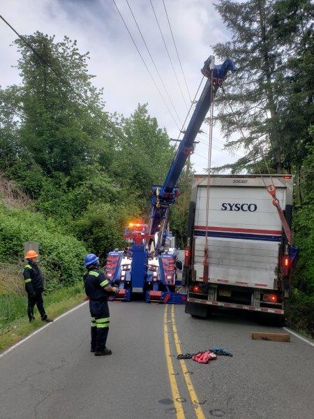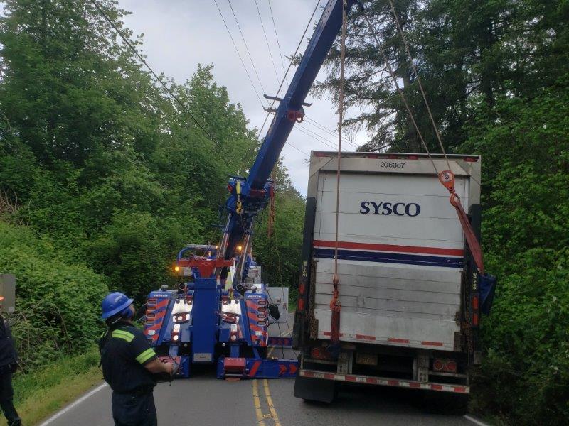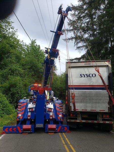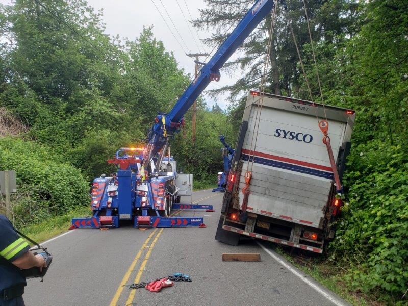 Our team carefully operated the rotator in harmony with the recovery truck parked in the front. We finally were able to get the truck and trailer back on the roadway and positioned for a heavy truck tow. We removed all the rigging and towed the casualty to a safe location.