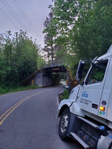 After creating a safe recovery plan, we needed to set things up to avoid overhead power lines and a low overpass while performing a 60-foot truck and trailer lift. It was a challenging heavy truck tow, but thankfully damage hadn’t caused an oil pan leak.