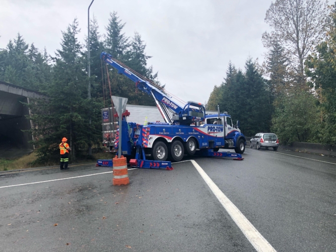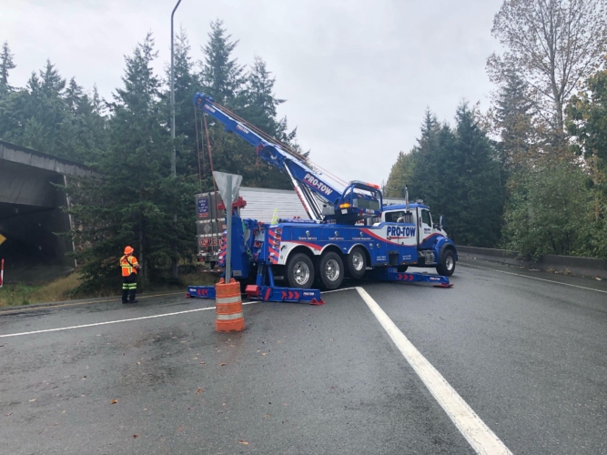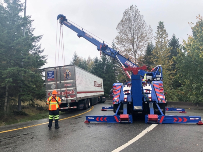 In this incident, on September 22, 2019, Pro-Tow responded to an emergency dispatch about a semi-truck that had gone off the road at state highway 18 and interstate 90 near Snoqualmie, WA. Fortunately, the semi-trailer was not damaged and only the back end had gone off the road. It needed an immediate semi-truck tow service to lift the trailer back on the road. The busy Snoqualmie highway needed to be opened as quickly as possible, so Pro-Tow was quick to respond.