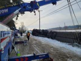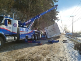 Team Pro-Tow was called to the scene to help with the semi-truck recovery. We brought our heavy-duty crane rotator and called our trusty Team Pro-Enviro to help with spill recovery and the potato cleanup.