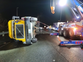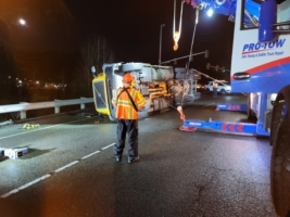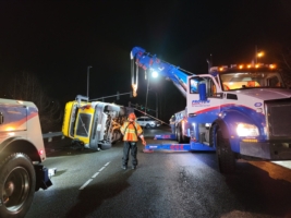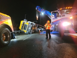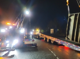 In this emergency dispatch, on February 26, 2021, In this incident, a Rental Truck still attached to its trailer overturned on the highway and needed a recovery and crane lift rescue. Our Team Pro-Tow responded quickly with our crane lift equipment and flatbed trailer and set out for the scene.