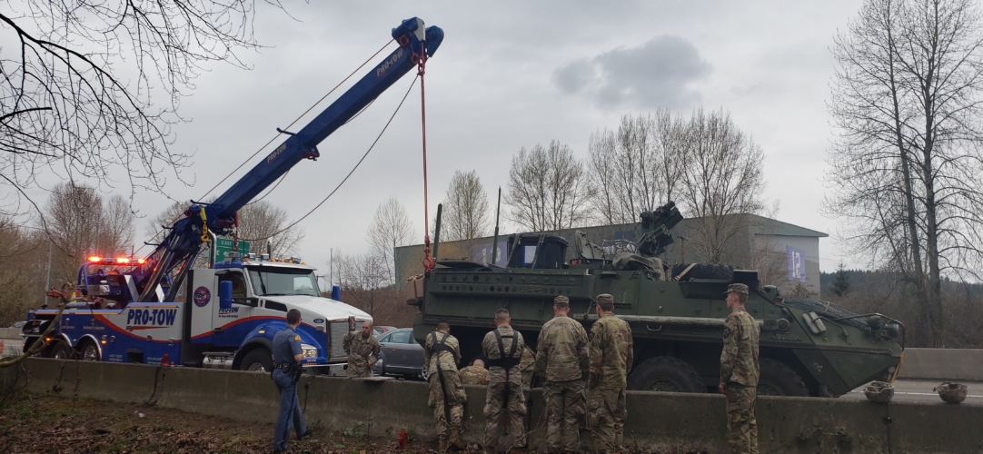 An Army Convoy was cruising down the I-405 in Renton, WA, during rush hour traffic when a tank suffered a flat tire. It was blocking a lane in a busy area, jamming up traffic and causing disruptions in everyone’s commute. They soon discovered that even a heavy jack system could fail under the weight of a 40,000-pound vehicle. This was a job for Team Pro-Tow!