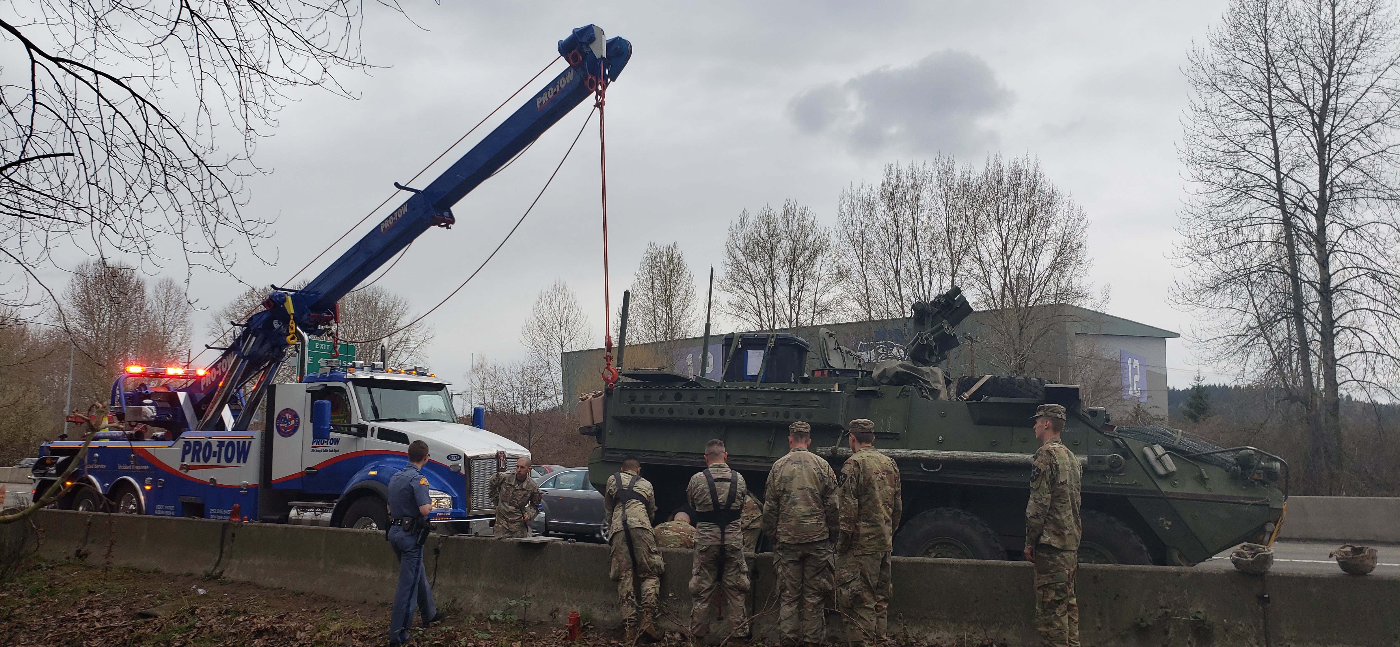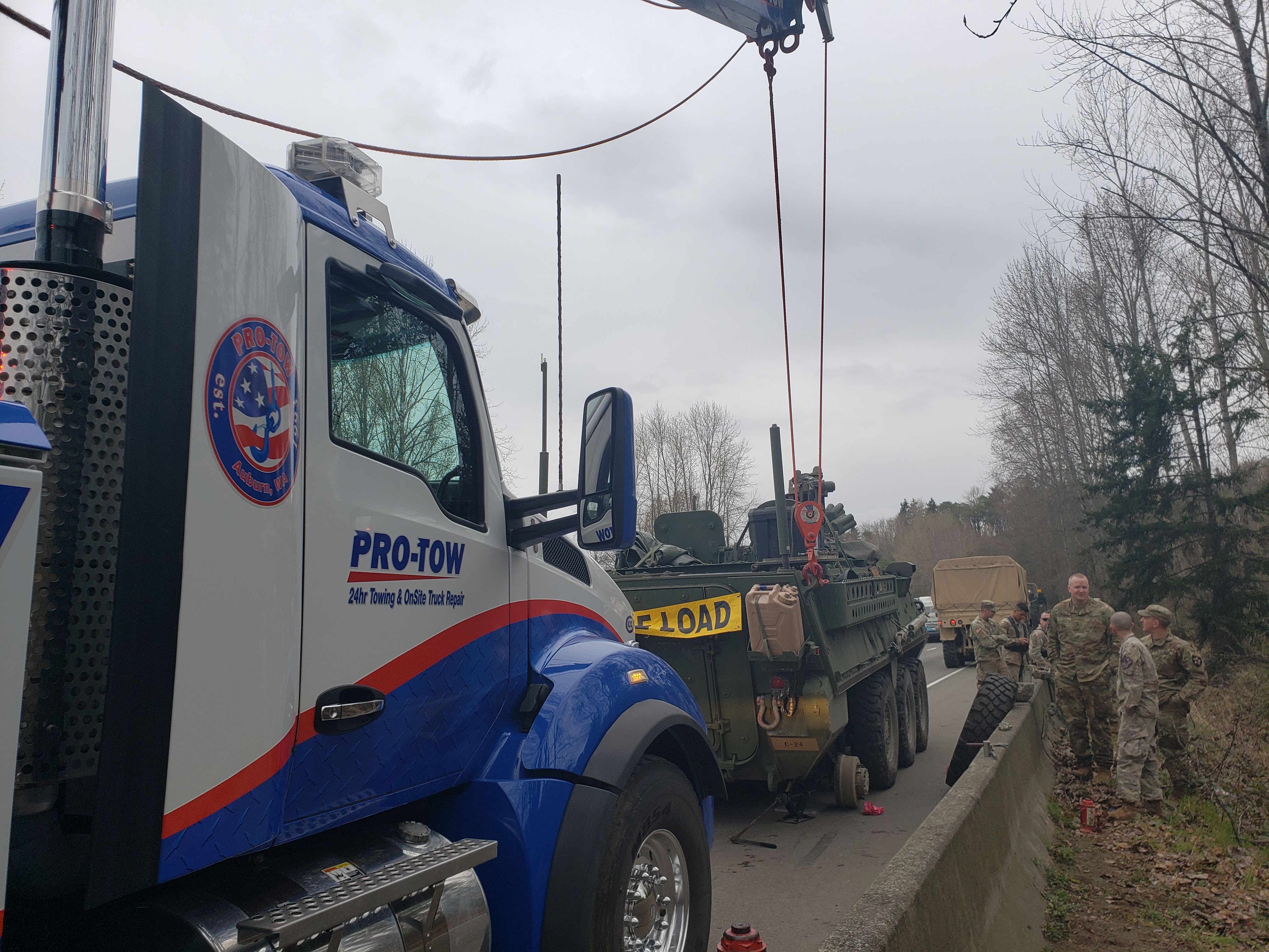 The time we helped out the US Military change a tire on a tank blocking traffic was a service call we will always remember! In March 2019, Team Pro-Tow responded to a call to help the Washington State Patrol, Washington State Department of Transportation, and the US Army to assist with a flat tank tire! It was literally roadside assistance for an army tank.