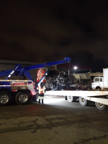 After surveying the scene, we created a truck recovery plan to remove the burned tractor from the scene. We carefully rigged up the tractor and lifted it onto a flatbed trailer. We were able to do the same with the trailer and larger debris. Then, our heavy-duty towing service removed the casualties from the area.