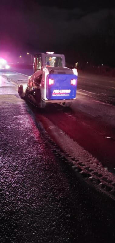 Then, our cleanup crew got to work on the remaining mess. Team Pro-Enviro used an industrial-grade grapple and Bobcat compact track loader to pick up the debris. We also used a specialized street sweeper to get the smaller bits. Once all the ashes, debris, truck parts and contaminated materials were safely cleaned up and secured on a dump trailer, we hauled it off for safe and regulation-compliant disposal.