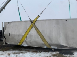 For this incident, our team brought along two heavy-duty wreckers. Once we arrived at the scene, we started with a scene assessment to decide the best and safest approach. The main recovery was the tipped-over trailer, which was off the road. We hooked up both heavy-duty wreckers in a sling-like approach around the trailer.
