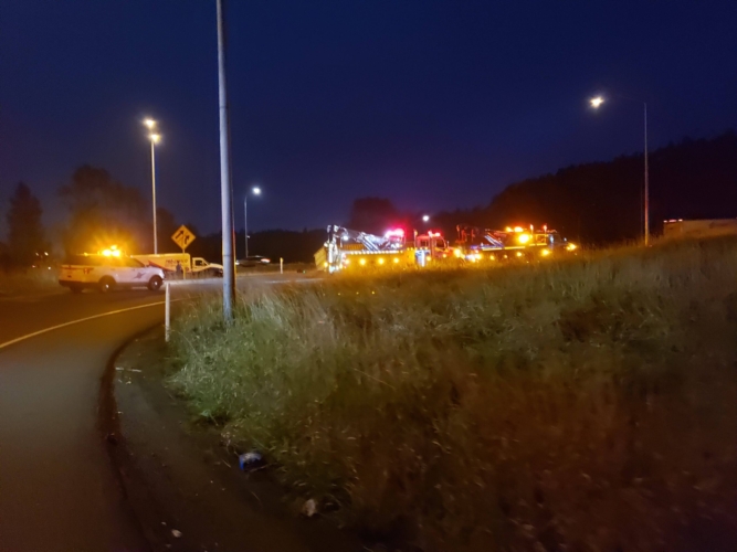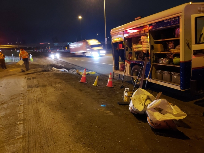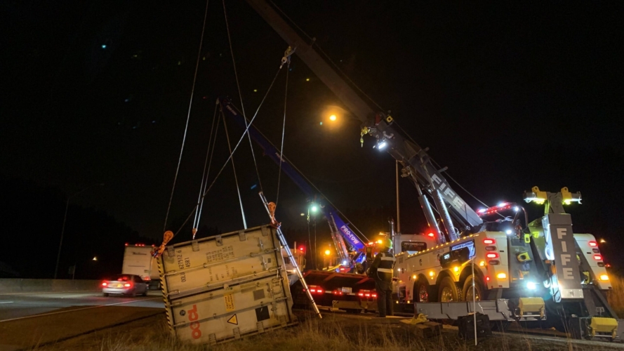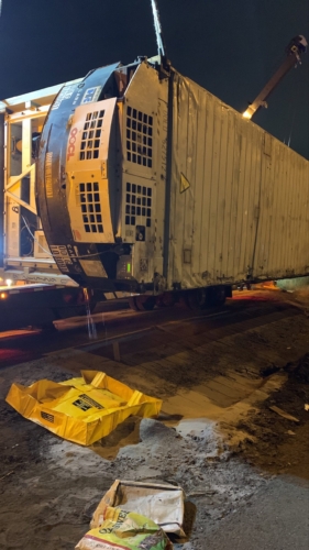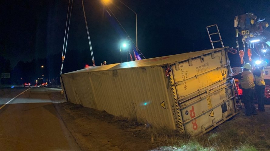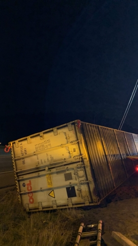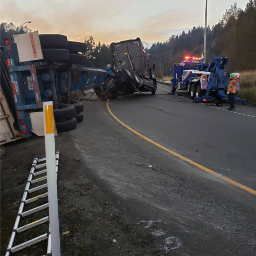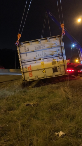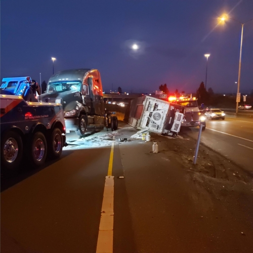 In this incident, on October 28th, 2020, A tractor-trailer had overturned on the onramp to WB SR18 and needed two heavy-duty recovery wreckers to help with this emergency incident response. We sent the requested equipment to the scene and then reported to the incident command post for further scene evaluation. We found that motor vehicle fluid was leaking onto the roadway and under the container. Once we got authorization from the driver’s agent, we began our truck accident recovery work.
