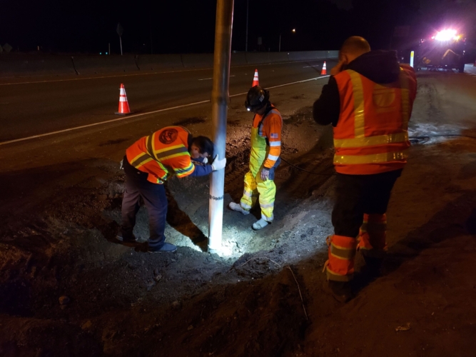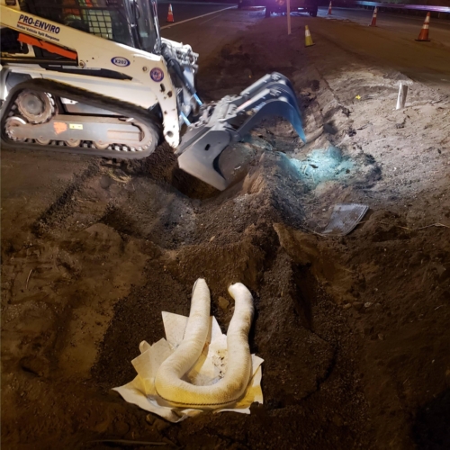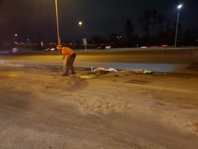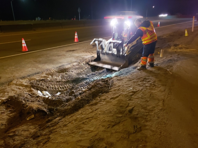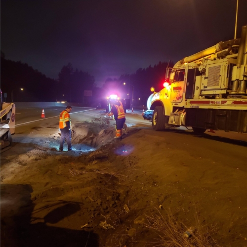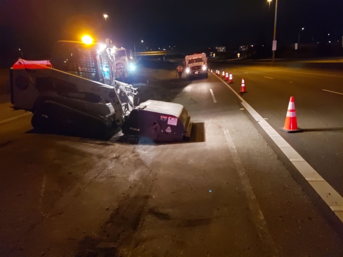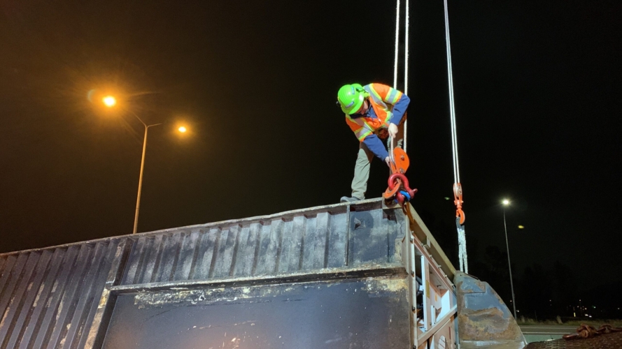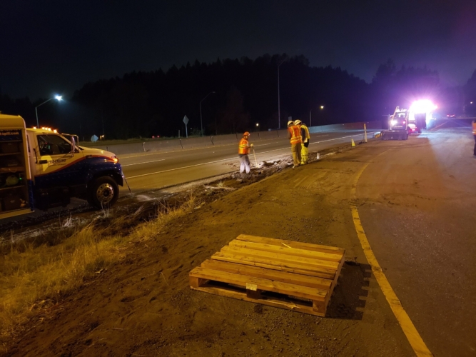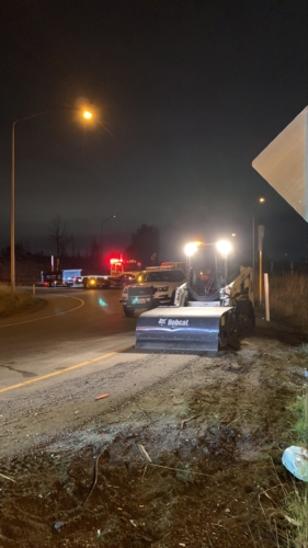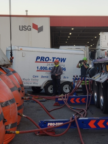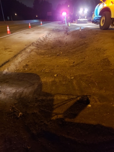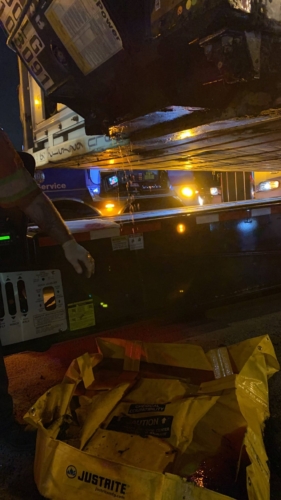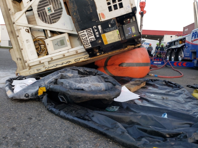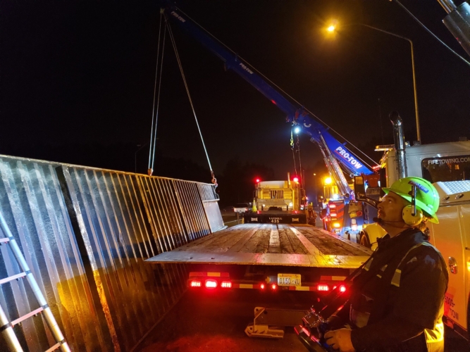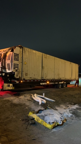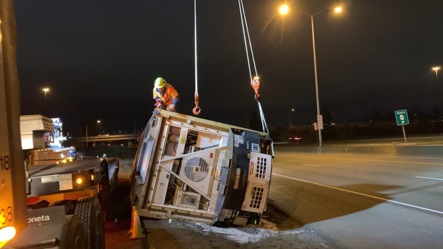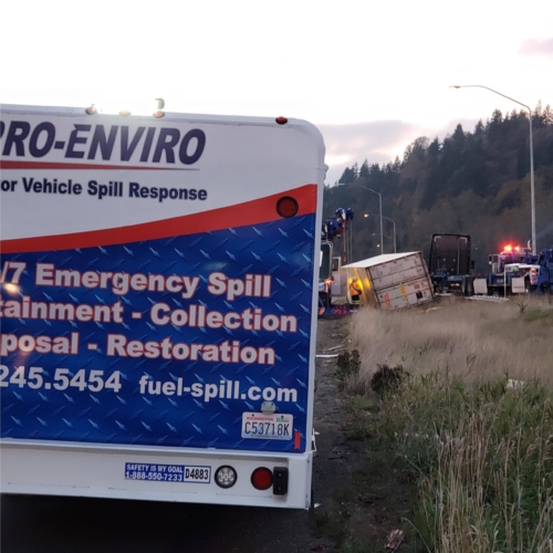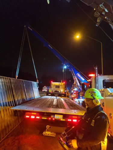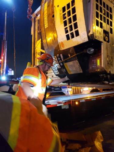 We successfully lifted the container but a new problem arose as the refrigerator fuel tank began to steam. We immediately deployed our recovery personnel to begin safe control measures to contain the new leak. Once it was safely contained, our team finished loading the suspended container and safely secured it, finalizing our emergency incident response. While our team moved the container and tractor to our secure storage yard, Pro-Enviro continued the roadway’s extensive cleanup work.