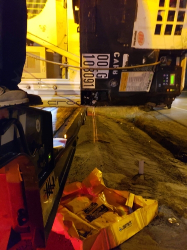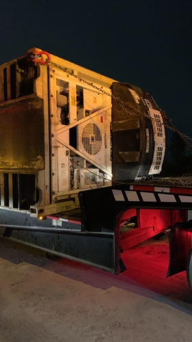 Crawford and Co., the insurance company, requested extraordinary measures to save the cargo inside the container. With authorization, we did a temperature test and visual inspection. We found the cargo was still frozen, so there was still a chance to save it. Our skilled team safely lifted the container without further damage. The customer supplied the necessary chassis with a power unit to power the refrigerated unit once again. A service tech handled the installation for us and continued to do service calls to ensure everything remained frozen.
