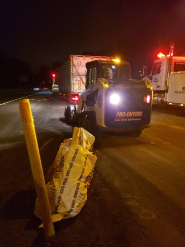 Pro-Enviro also came to the scene with special equipment to handle the spill, including a flatbed tow truck, dump trailer, and compact track loader with specialized attachments. After some calculations, we needed even more specialized equipment. We called for a heavy-duty Landoll and another heavy-duty recovery wrecker to handle this recovery.