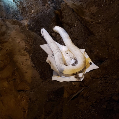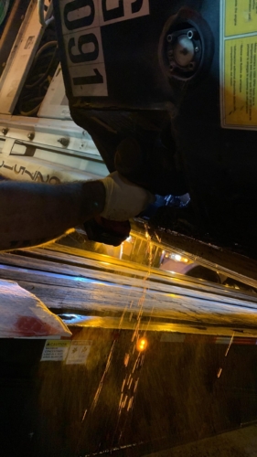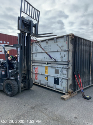 Even at the storage yard, there was more work to do to complete the job. During the set-up for a safe unload and righting of the container, it began to bulge on one side and make noises immediately deemed unsafe. To prevent the risk of bursting, we left the container until morning when our team could have better light to revaluate the final steps of the truck accident recovery.