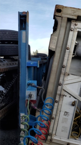 Once the container was detached, we successfully righted the tractor and set it up for transport to a safe location while the emergency incident response work continued. Using a heavy-duty rotating crane style wrecker, we performed an overhead crane lift. We then prepared to load the container onto the Landoll. For added safety we installed specialty rigging to help with the limit for safe working loads.