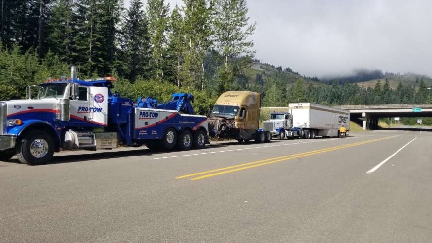 We worked directly with the Washington State Department of Transportation and Washington State Patrol. Team Pro-Tow was able to bring the semi-truck back to the roadway for safe transport.