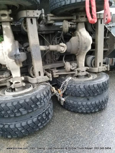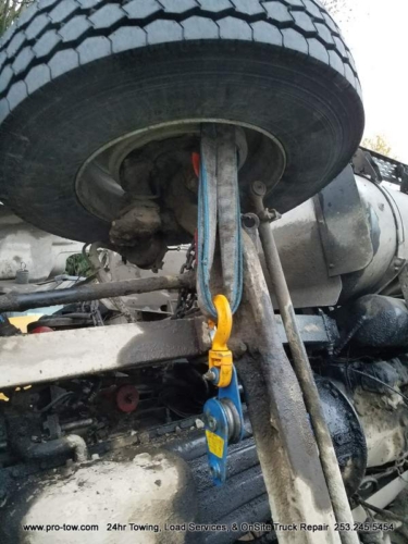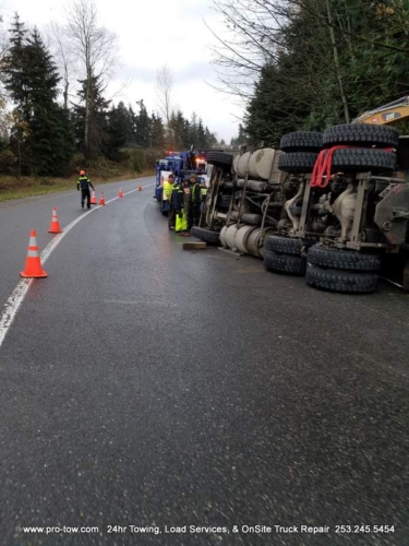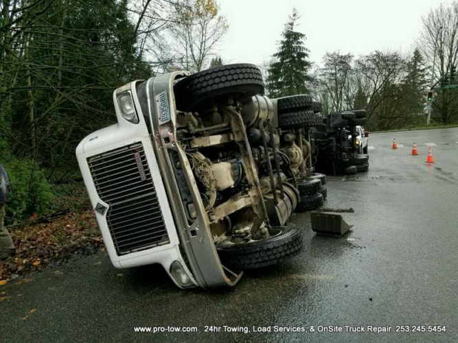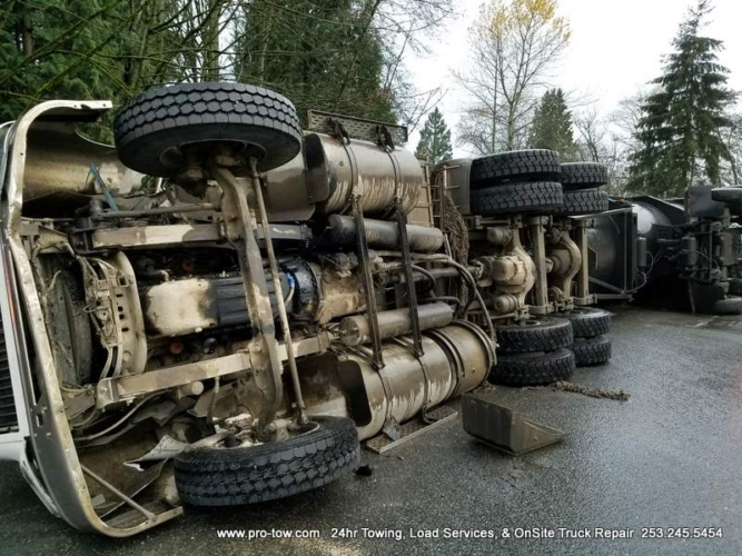 The end dump truck flipped onto its side during rush hour traffic on Interstate 405, north of Bellevue in Kirkland, WA. They required a prompt semi-truck tow service to get the truck back on its wheels and moved, so traffic could start flowing again. Our team provided this service, developing a recovery plan upon arriving at the semi-truck accident and executing it safely and effectively.