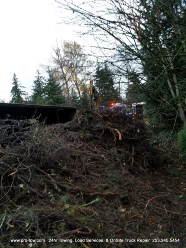 Our Pro-Enviro division responds to the scene when there is diesel fuel, oil or other vehicle fluids spilled after a semi-truck accident. They weren’t needed in this case. This semi-truck end dump truck lost over 90lbs of wood debris, which thankfully, is completely biodegradable.