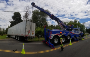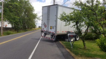 A tight right-hand turn can cause a truck to hit the curb or other vehicles, or it can cause the trailer to slip off the road, as it did in this case. Truck drivers can avoid the need for semi-truck towing, slowly approach the turn with the truck positioned in the right lane. Take the turn wide, but avoid swinging too much to the left. If you must, wait for vehicles to go by.