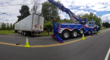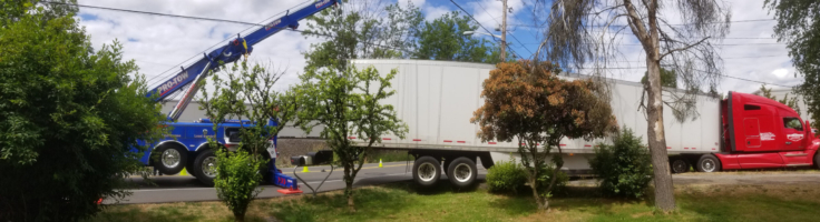 In this incident, all it took was a little lift and straightening the back of the trailer. Our trained operators use our fleet of rotator crane-style wreckers to safely rig and lift trucks, trailers and heavy equipment. Our heavy towing service is vital to local fleets, and we are ready to assist 24 hours a day.