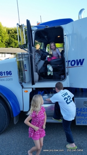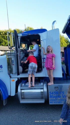 During a recent trip to Ferndale, WA to tow a tractor a trailer back to Seattle, WA we decided to stop and do a little training and recruiting at the same time. What we found was a few fabulous kids with great potential to be top tier tow truck operators. Their aptitude to operate the remote controls was like no other. They were able to flawlessly operate the tow truck boom. In addition, their excitement to work was incredible. The police and highway departments will be in good hands as these recruits perfect their skills.