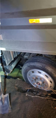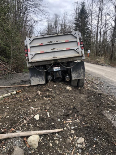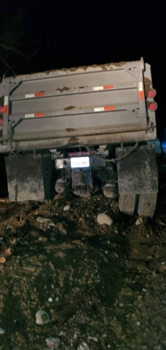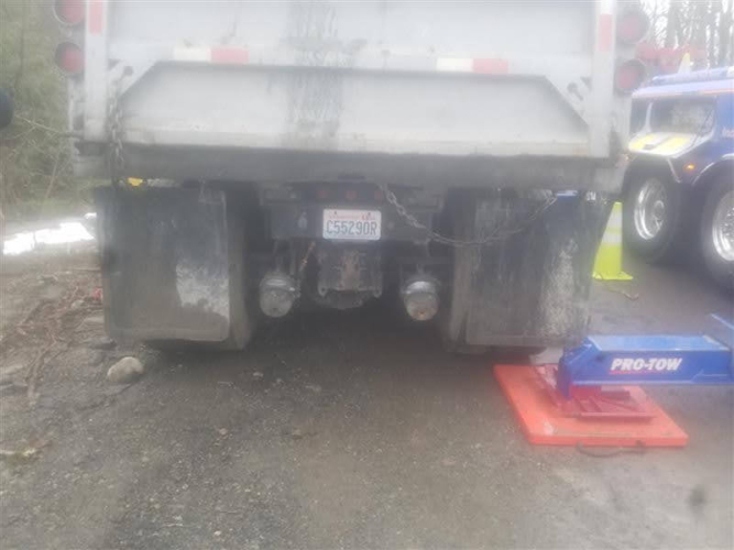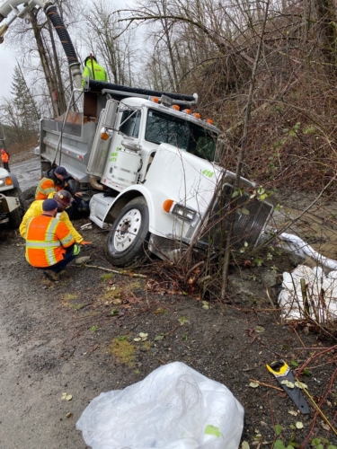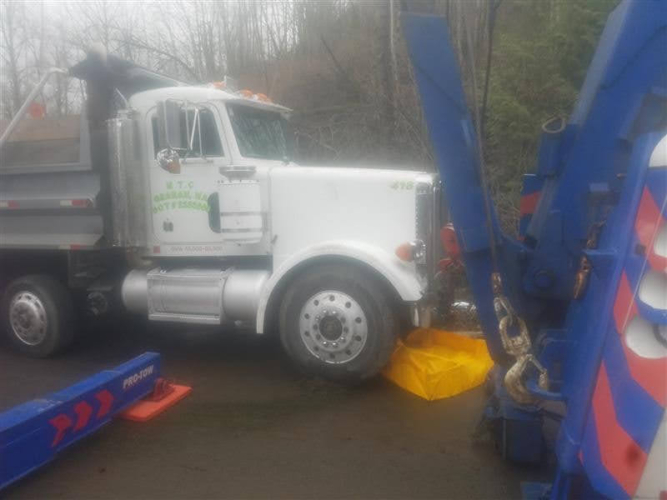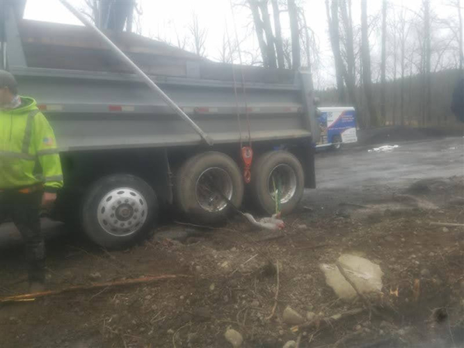 Because of regulations and a general concern for safety and the environment, we could not transport the damaged dump truck before fixing the leak in the fuel tank. We were able to give it a temporary fix to keep it from dripping fuel on the route. Then we took it to a secured storage yard and installed a portable parking stall containment berm to prevent any potential leaks from contaminating the area.