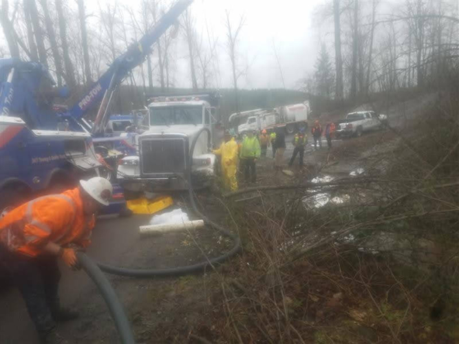 On the scene, we saw that the client had vacuum trucks already working on the initial clean up stages. Once that was complete, we accessed the incident and came up with a plan for spill recovery and truck accident recovery. Once our cranes performed an overhead lift of the dump truck to get it back on the road, we got to work cleaning up the spilled fuel.